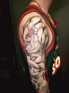 鲤鱼般若结合的花臂纹身图案