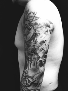 花臂幽美的黑白风景纹身图案
