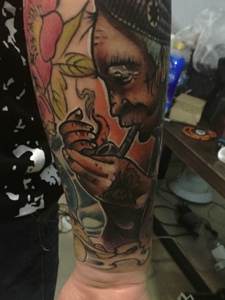 花臂正在吸烟的老奶奶个性纹身刺秦