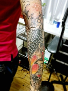 花臂彩色鲤鱼纹身图案青春活力十足
