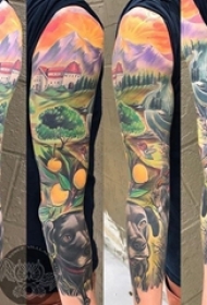 欧美花臂纹身 男生手臂上小狗和风景纹身图片