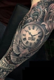 纹身钟表 男生手臂上黑灰纹身钟表时尚花臂纹身图片