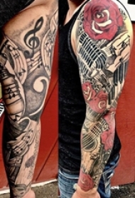 欧美花臂纹身 男生手臂上花朵和吉他纹身图片