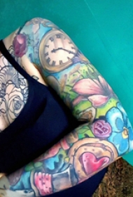 花臂纹身 女生手臂上花朵和钟表纹身图片