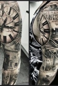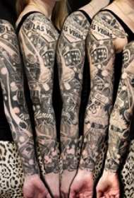 文艺花臂纹身男生手臂上黑色的骷髅花臂纹身图片