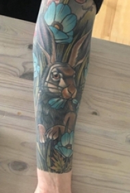 男生手臂上彩绘水彩素描可爱兔子花臂纹身图片