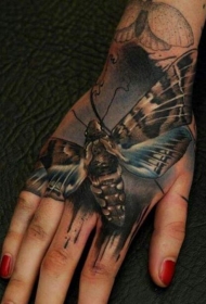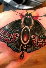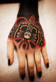 手臂神秘的彩色骷髅与手和蝴蝶纹身图案