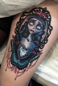 大腿插画风格彩色僵尸新娘与钻石和蝴蝶纹身图案
