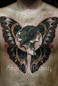 胸部彩色女人和男人肖像与蝴蝶翅膀纹身图案