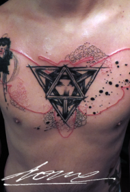 胸部神秘的彩色蝴蝶轮廓与几何符号纹身图案