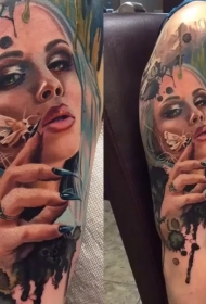 大臂逼真的彩色女人肖像与蝴蝶纹身图案