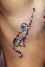 侧肋有趣的彩色蝴蝶与猫咪纹身图案