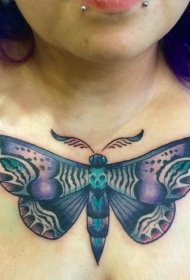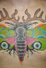 胸部彩色有趣的蝴蝶与鹿角和眼睛纹身图案
