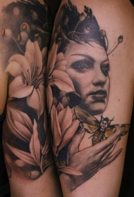 手臂超自然的女人肖像和蝴蝶纹身图案