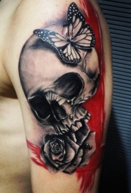大臂骷髅与玫瑰和蝴蝶纹身图案