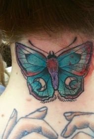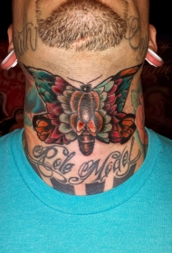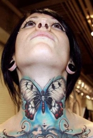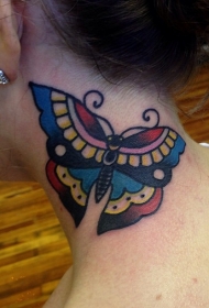 女生颈部彩色蝴蝶与白色骷髅纹身图案