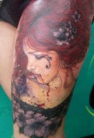 大腿彩色血腥妇女与蝴蝶和花朵纹身图案