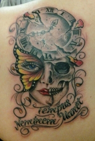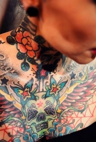 胸部墨西哥传统彩色骷髅翅膀与蝴蝶字母纹身图案