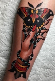 手臂old school彩色女人手蝴蝶和珠宝纹身图案