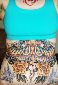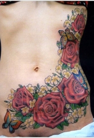 腹部五彩的玫瑰小花和蝴蝶纹身图案