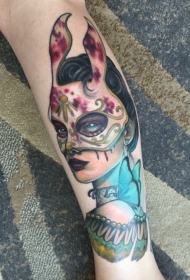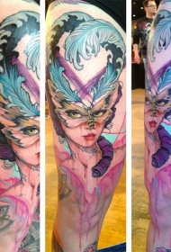 大腿old school女郎和蝴蝶面具水墨纹身图案