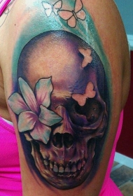大臂彩色骷髅花朵和蝴蝶纹身图案