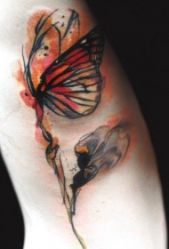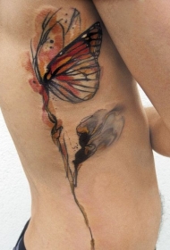 侧肋水墨画蝴蝶与花蕊纹身图案