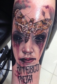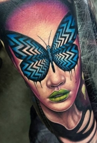 new school彩色蓝色蝴蝶和女人脸手臂纹身图案