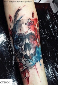 水彩泼墨风格的彩色骷髅和蝴蝶手臂纹身图案