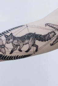 雕刻风格的黑色的狐狸与骷髅和蝴蝶手臂纹身图案