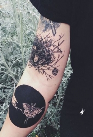 手臂不寻常的鸟巢和黑色圆圈蝴蝶纹身图案