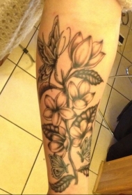 大臂白色的写实山茱萸花和蝴蝶纹身图案