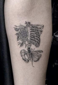 手臂黑色的人体骨架和蝴蝶花朵纹身图案
