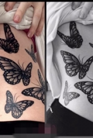 女生侧腰上黑白点刺技巧小动物几何元素蝴蝶纹身图片
