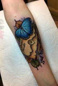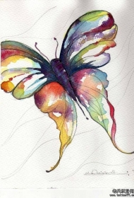 女生手臂上彩色水墨花蝴蝶纹身图片