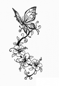 黑色的蝴蝶和植物藤花朵的简单线条纹身手稿