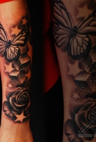 手臂黑白蝴蝶与骰子和玫瑰纹身图案