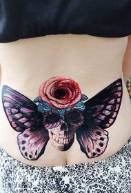 蝴蝶与骷髅玫瑰腰部纹身图案