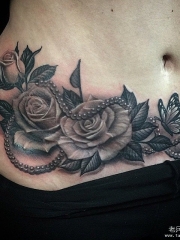 腹部欧美玫瑰珍珠蝴蝶黑灰纹身图案