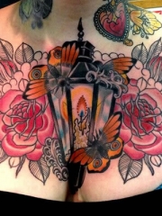美女胸部尽情绽放的花卉与灯蝴蝶纹身