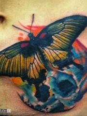 腹部彩色的骷髅和蝴蝶纹身图案