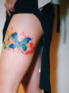 大腿处的水彩蝴蝶纹身图案很抢眼