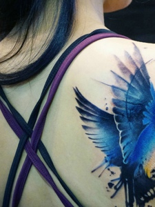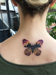 女生右边背部的水彩蝴蝶纹身图案