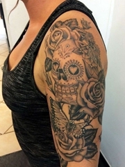 女子左手大臂黑灰色骷髅头纹身图案