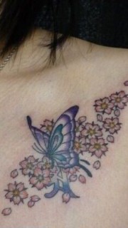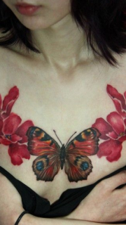 女性胸前蝴蝶和花纹身