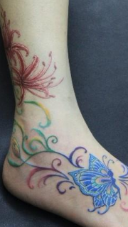 靓女脚部彩色蝴蝶精灵藤蔓纹身