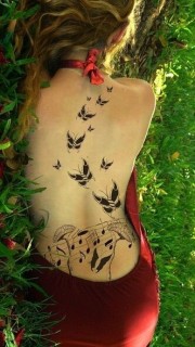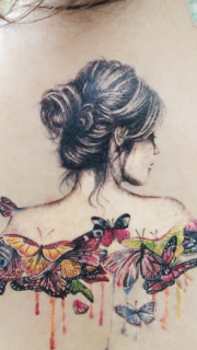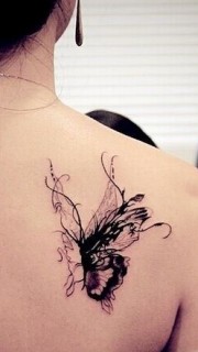女性背部唯美漂亮音符蝴蝶朵纹身