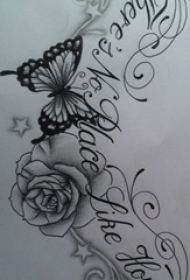 黑灰素描创意唯美蝴蝶和玫瑰纹身手稿