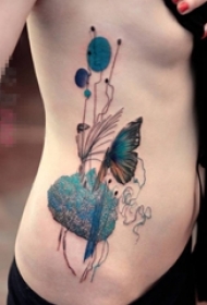 女生侧腰上彩绘创意几何线条花朵和蝴蝶纹身图片