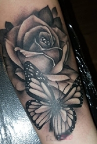 女生手臂上黑灰素描点刺技巧文艺蝴蝶和玫瑰纹身图片